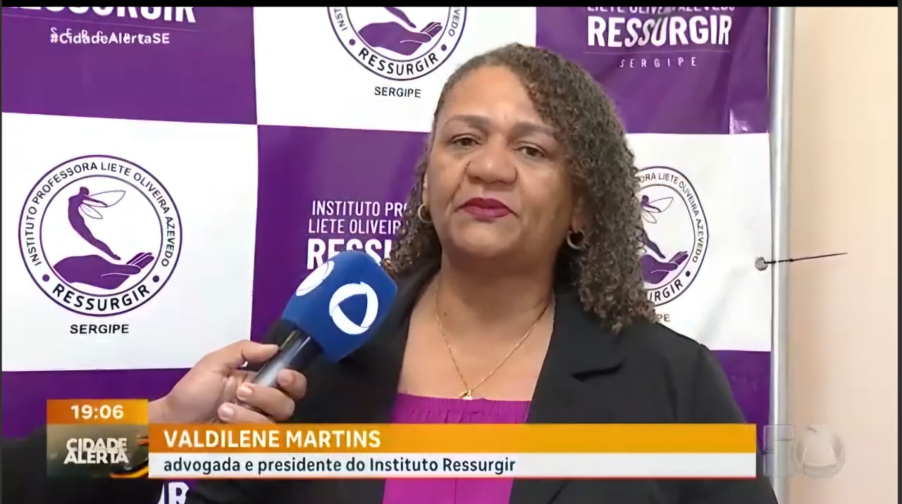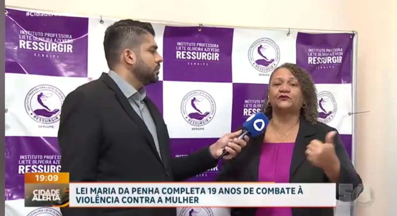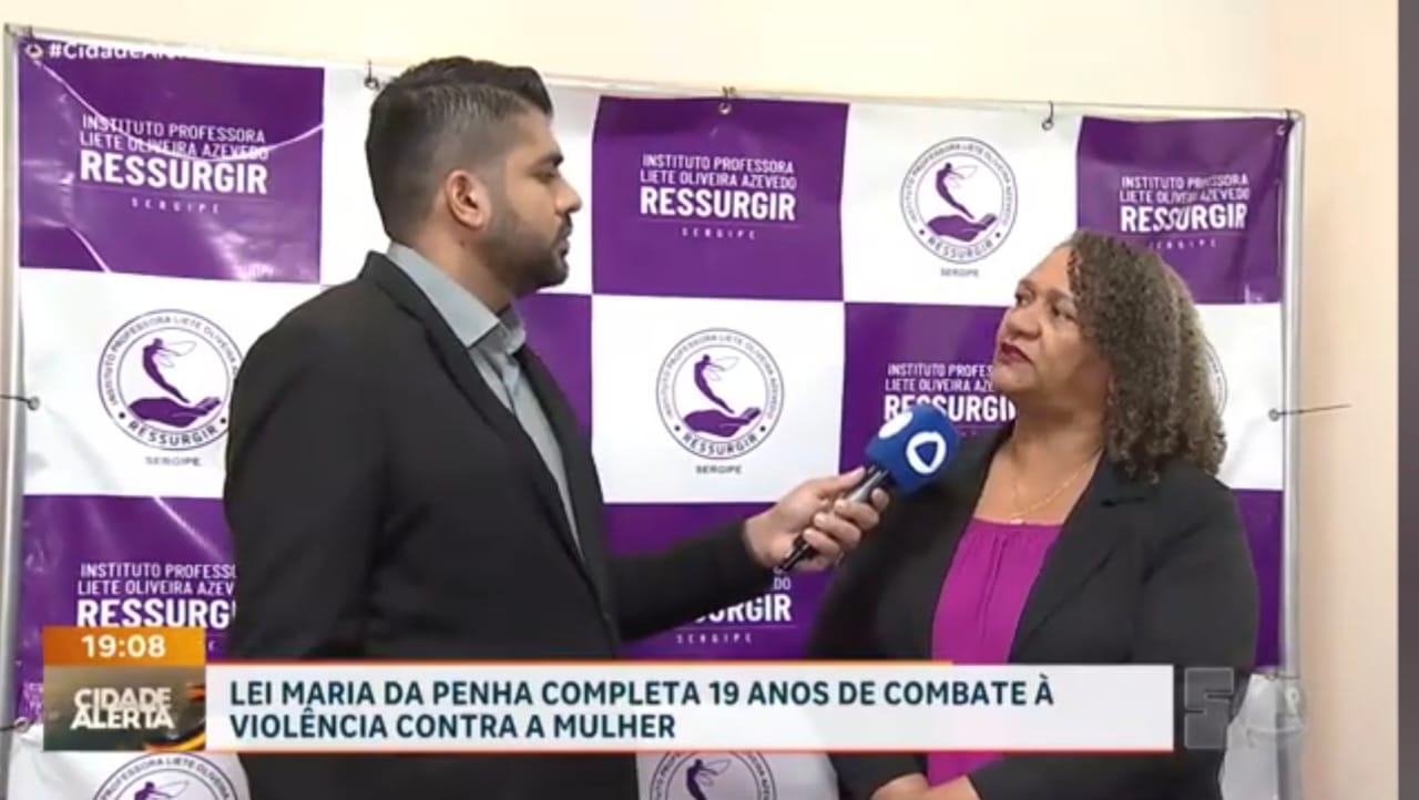 Na noite de 08.08.2025, o Instituto RESSURGIR Sergipe, representado pela sua presidente, Valdilene Oliveira Martins, concedeu entrevista ao repórter Lucas Moura, para o Programa Cidade Alerta Sergipe, da TV Atalaia, apresentado pela jornalista Mariana Sena, para falar sobre os 19 anos da Lei Maria da Penha que é um marco no combate à violência doméstica e familiar contra a mulher, trazendo medidas preventivas, punições mais rigorosas e atendimento especializado para as vítimas.