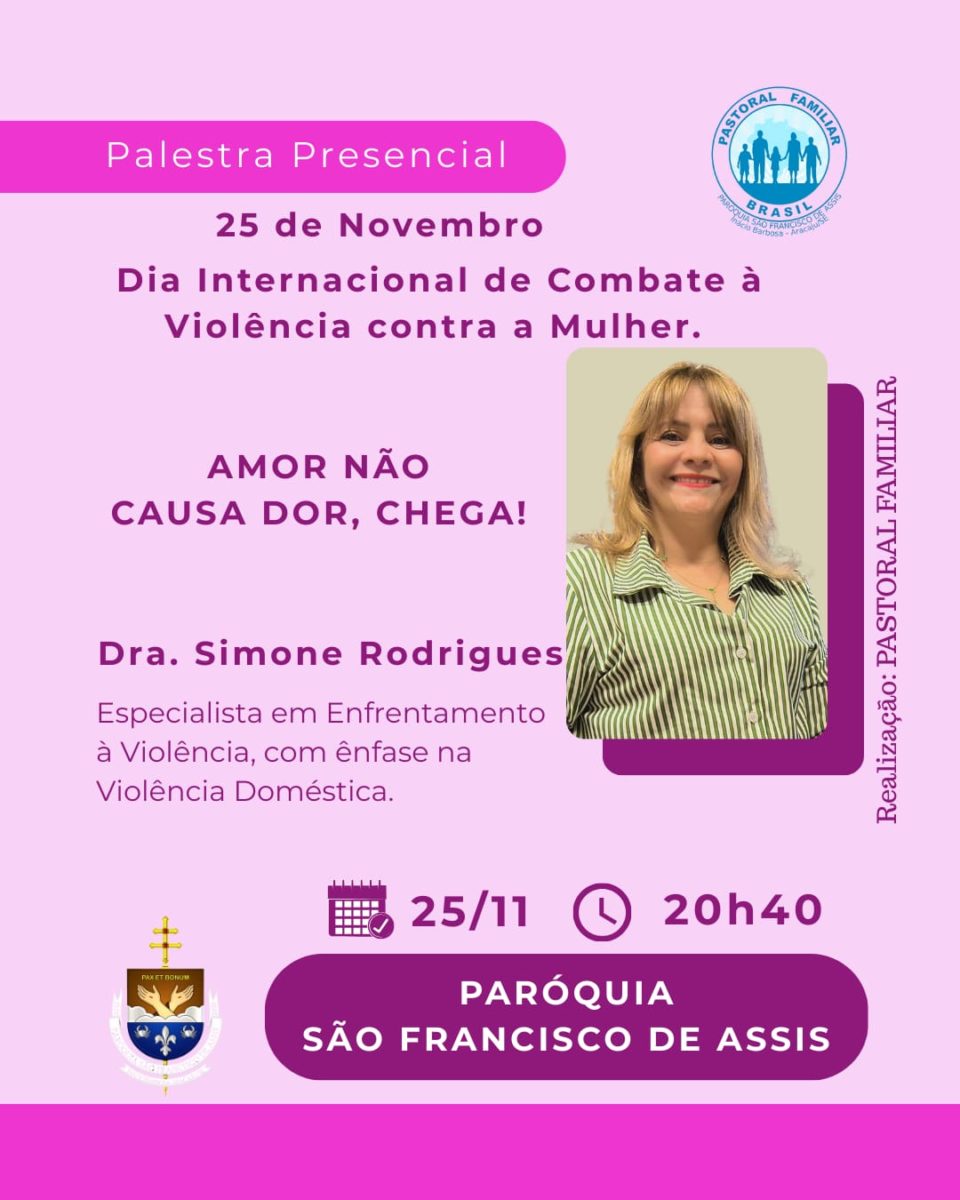 Na noite de 25.11.2025, o Instituto RESSURGIR Sergipe, representado pela advogada e voluntária, dra Simone Rodrigues, após a celebração da missa, proferiu palestra sobre violência doméstica e familiar contra a mulher, para paróquianos da Igreja São Francisco de Assis, localizada na Rua Mercúrio, S/N, Conjunto Inácio Barbosa, Aracaju – SE.