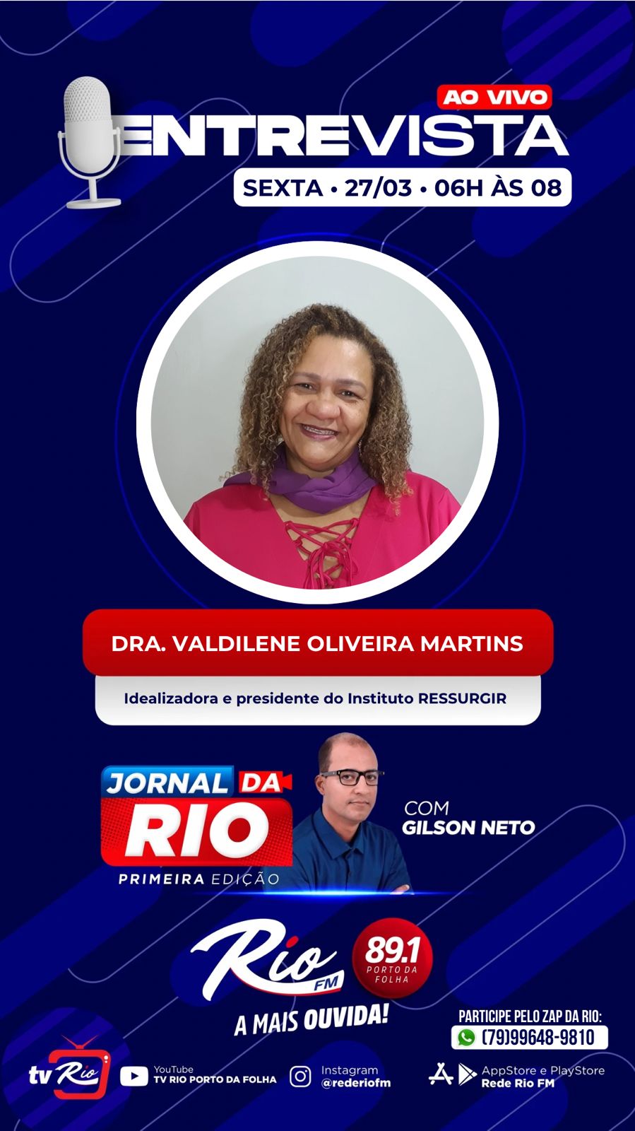 Na manhã de 27.03.2026, o Instituto RESSURGIR Sergipe, representado pela presidente Valdilene Oliveira Martins, concedeu entrevista ao radialista Gilson Neto, para o Jornal da Rio, 1a Edição, da FM Rede Rio de Porto da Folha, para falar sobre o alto índice de violência contra a mulher e de feminicídios em Sergipe e no Brasil.
